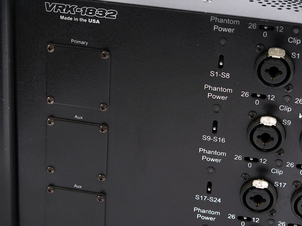 The VRK-1832 contains 32 mic/line inputs (sends) and 8 analog line